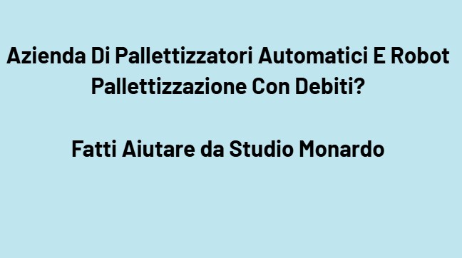 La tua azienda che produce, integra, installa o manutiene pallettizzatori automatici, robot di pallettizzazione, isole robotizzate, sistemi di fine linea, nastri trasportatori, pinze e teste di presa, magazzini pallet, impianti di movimentazione, soluzioni di packaging e automazione industriale sta attraversando una crisi finanziaria dovuta ai debiti? Fatti Aiutare da Studio Monardo