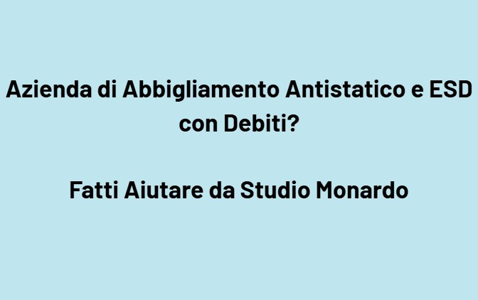 La tua azienda che produce o distribuisce abbigliamento antistatico, indumenti ESD, camici e tute per camere bianche, calzature ESD, guanti e accessori certificati, abbigliamento tecnico per elettronica e automazione, tessuti conduttivi, abbigliamento da lavoro specializzato e DPI per laboratori e reparti produttivi è entrata in difficoltà a causa dei debiti? Fatti Aiutare da Studio Monardo
