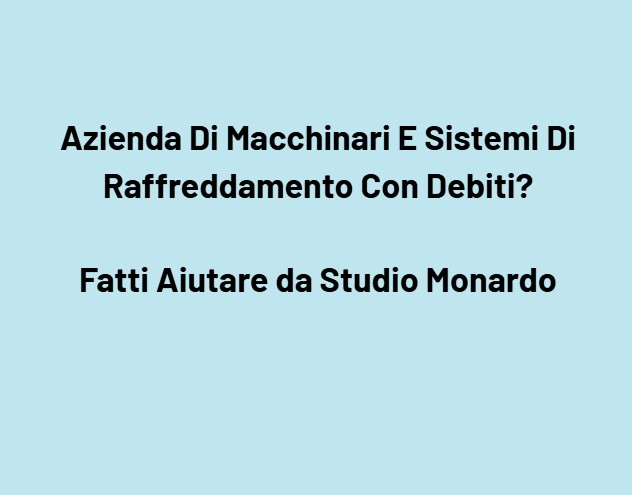 La tua azienda che produce, installa o manutiene macchinari e sistemi di raffreddamento, chiller industriali, scambiatori di calore, torri evaporative, unità refrigeranti, raffreddatori ad acqua e ad aria, impianti HVAC, sistemi per processi industriali, componenti frigoriferi e compressori è oggi in difficoltà a causa dei debiti? Fatti Aiutare da Studio Monardo