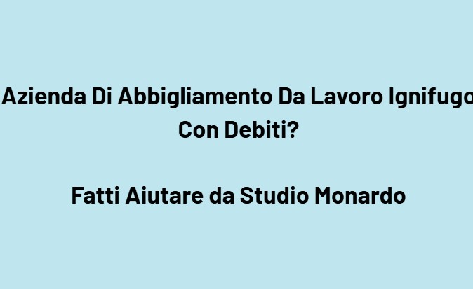 La tua azienda che produce, importa o distribuisce abbigliamento da lavoro ignifugo, tute antifiamma, indumenti FR, DPI certificati EN ISO 11612, abbigliamento per saldatori, indumenti antistatici e ignifughi, abbigliamento per industrie oil & gas, tessuti protettivi, calzature e accessori ignifughi si trova in difficoltà a causa dei debiti? Fatti Aiutare da Studio Monardo