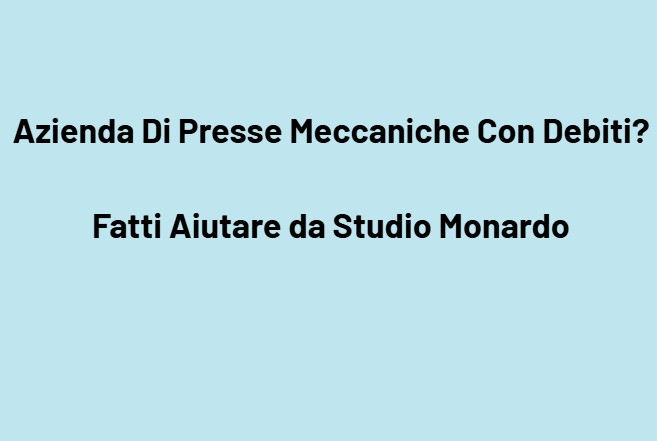 La tua azienda che produce, vende, revisiona o manutiene presse meccaniche, presse eccentriche, presse oleodinamiche, presse per stampaggio a freddo, linee di alimentazione coil, aspi svolgitori, raddrizzatrici, alimentatori, stampi e attrezzature per la deformazione lamiera, o che fornisce servizi di assistenza e retrofit si trova oggi in difficoltà a causa dei debiti? Fatti Aiutare da Studio Monardo