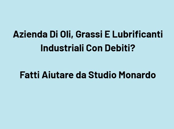 La tua azienda che produce, miscela, importa o distribuisce oli industriali, lubrificanti, grassi tecnici, oli idraulici, oli per compressori, oli motore, lubrificanti per macchine utensili, additivi, fluidi da taglio, lubrificanti sintetici o soluzioni per automotive, metalmeccanica, manutenzione e industria è oggi in difficoltà a causa dei debiti? Fatti Aiutare da Studio Monardo