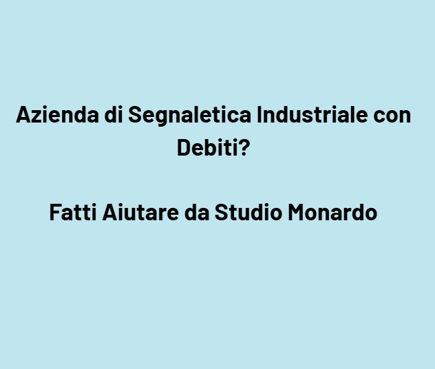 La tua azienda che produce, stampa, installa o distribuisce segnaletica industriale, cartelli di sicurezza, etichette adesive, marcature pavimentali, segnaletica personalizzata, pittogrammi, pannelli fotoluminescenti, totem informativi, targhe e sistemi di identificazione per magazzini, industrie e logistiche, oggi è schiacciata dai debiti? Fatti Aiutare da Studio Monardo