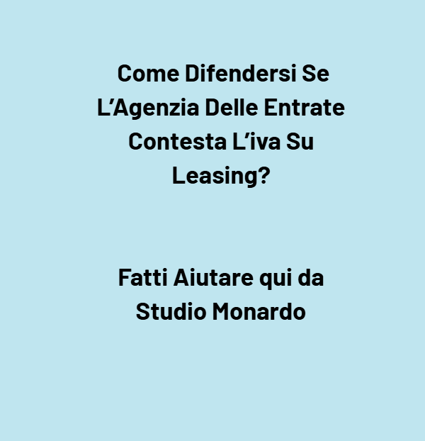 👉 📩 Contatta subito qui di seguito l’Avv. Giuseppe Angelo Monardo per una valutazione legale personalizzata e immediata sulla tua situazione fiscale. Grazie alla sua esperienza e al lavoro sinergico del suo staff, potrai difenderti efficacemente dalla contestazione IVA sul leasing, proteggendo il tuo patrimonio e facendo valere i tuoi diritti di contribuente.