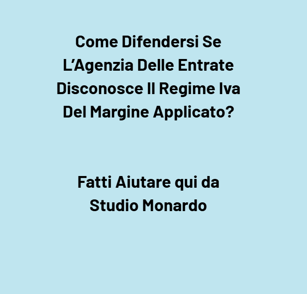Se hai ricevuto un atto di contestazione dal Fisco sul regime del margine IVA, non restare in attesa: Contatta subito l’Avv. Giuseppe Angelo Monardo per una valutazione legale personalizzata e immediata. 📩 Il suo team di avvocati e commercialisti esperti in diritto tributario ti illustrerà le soluzioni operative più efficaci per tutelare i tuoi diritti e bloccare le pretese illegittime dell’Agenzia delle Entrate.