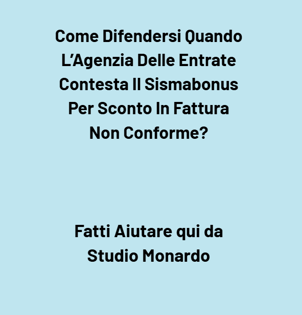 📩 Contatta subito qui di seguito l’Avv. Giuseppe Angelo Monardo per una valutazione legale personalizzata e immediata. Il nostro team valuta la tua situazione e definisce insieme a te la strategia migliore per difenderti da qualsiasi contestazione legata al Sismabonus e all’opzione sconto in fattura. Non aspettare la scadenza dei termini: agire tempestivamente è essenziale per tutelare i tuoi diritti e bloccare eventuali esiti negativi (pignoramenti, ipoteche, sanzioni).